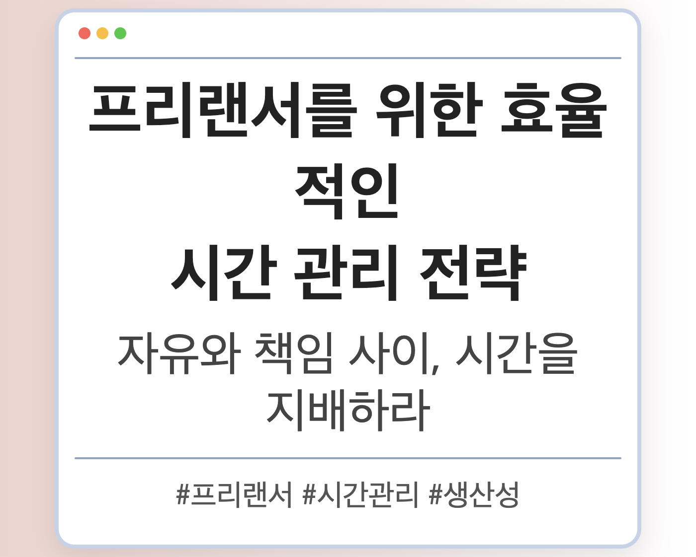 프리랜서를 위한 효율적인 시간 관리 전략은 단순히 시간을 절약하는 것을 넘어, 삶의 질을 향상시키는 중요한 기술입니다. 이 글에서 제시된 방법들을 참고하여 자신만의 시간 관리 시스템을 구축하고, 자유와 책임을 조화롭게 누리는 프리랜서로 성장하시길 바랍니다.